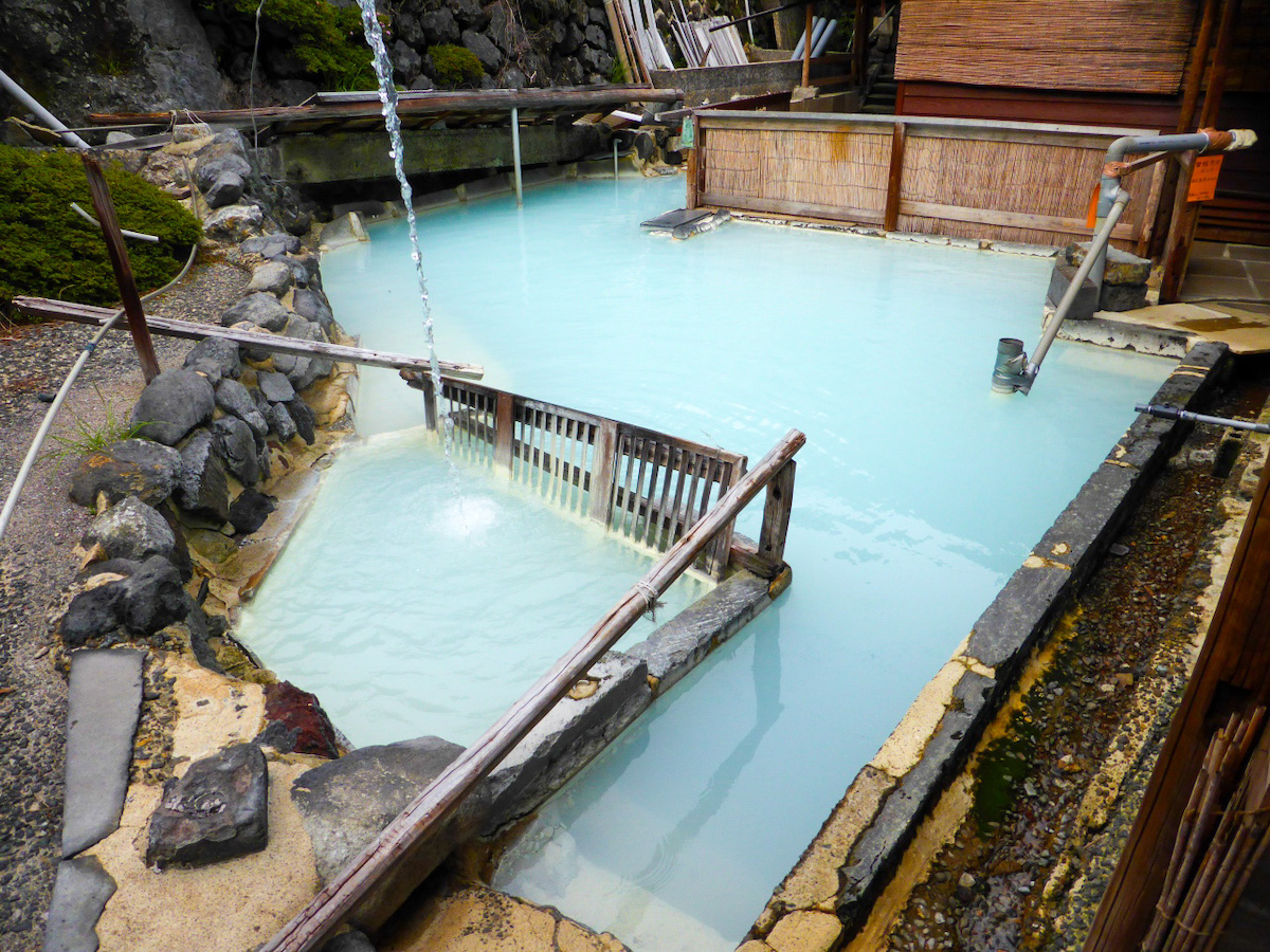 赤松林に囲まれた自然豊かな一軒宿で、乳白色の温泉と開放的な混浴露天風呂を楽しむことができます。 硫化水素を含む温泉のため入浴は30分以内を推奨しているようです。