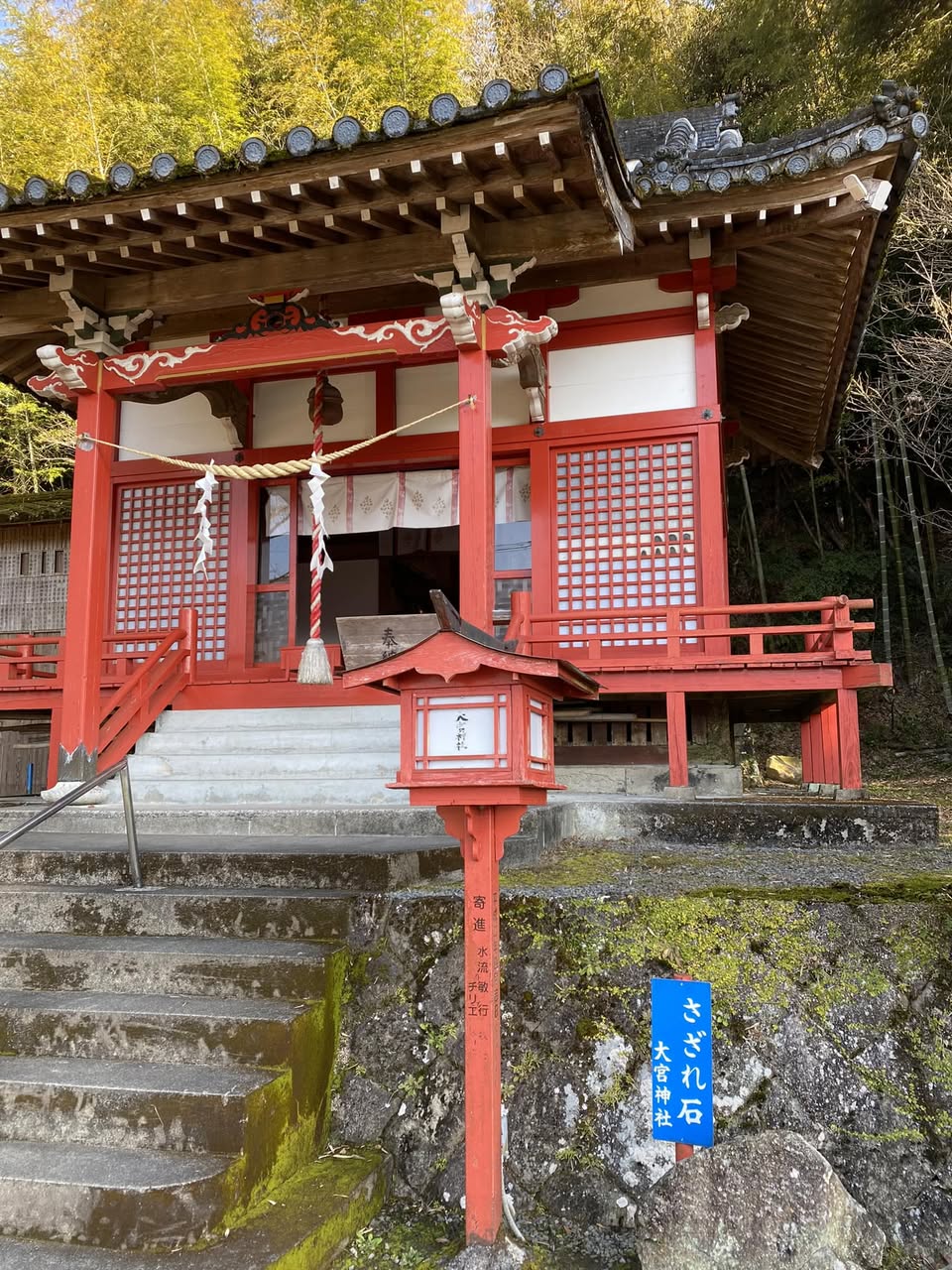 鹿児島市内より入来峠を越えて入来町に入ると右手にひっそりと大宮神社が見えてきます。そんなに大きな神社ではありません。中世以降、入来院氏の総社だそうです。 ここ、大宮神社で奉納されている入来神舞は「君が代」の基といわれています。 入来神舞は,天の岩戸神話を演じたもので、その中の一つに「十二人剣舞」があり、舞人が左手に太刀を持って登場し鬼神の前に出て「君が代は千代に八千代にさざれ石の巌となりて苔のむすまで」と朗詠されるそうです。 これが国歌の始まりになったといわれています。 大宮神社のバス停も「日の丸」となっています。 「君が代」の発祥の神社でバス停も「日の丸」!、凄すぎて!思わず手を合わせてきました。