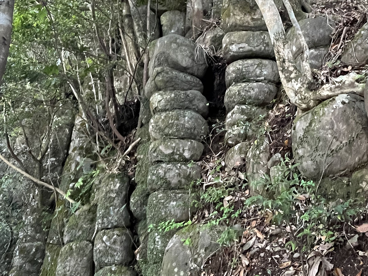 山の中腹に一抱えくらいの大きさの石が10mほど何箇所も積み上げられています。