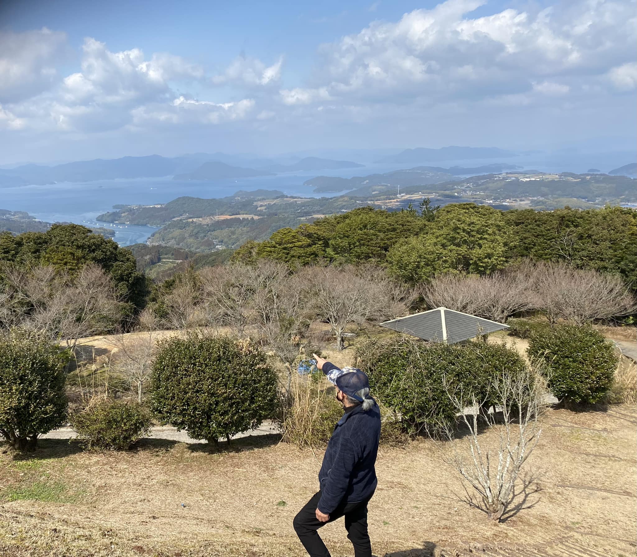 長島の中央にそびえる標高394mの山です。伊唐島、獅子島や天草の島々が目の前に息を呑むような絶景が広がっていました。また毎年2月は出水からシベリアに向かう鶴の北帰行を眼下に見下ろせる場所で、トイレの壁には鶴の実物大のリアルなオブジェが飾ってあります。