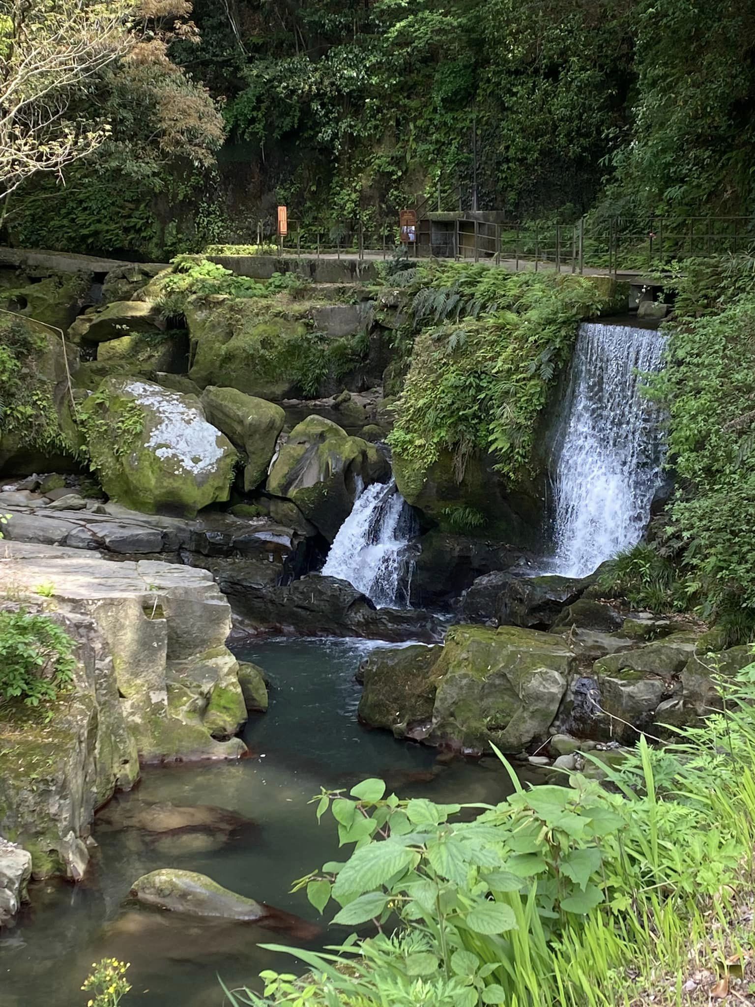 疏水溝に到着すると遊歩道の先にはグリーンに苔むした岩石の間を清流が勢いよく流れていました。