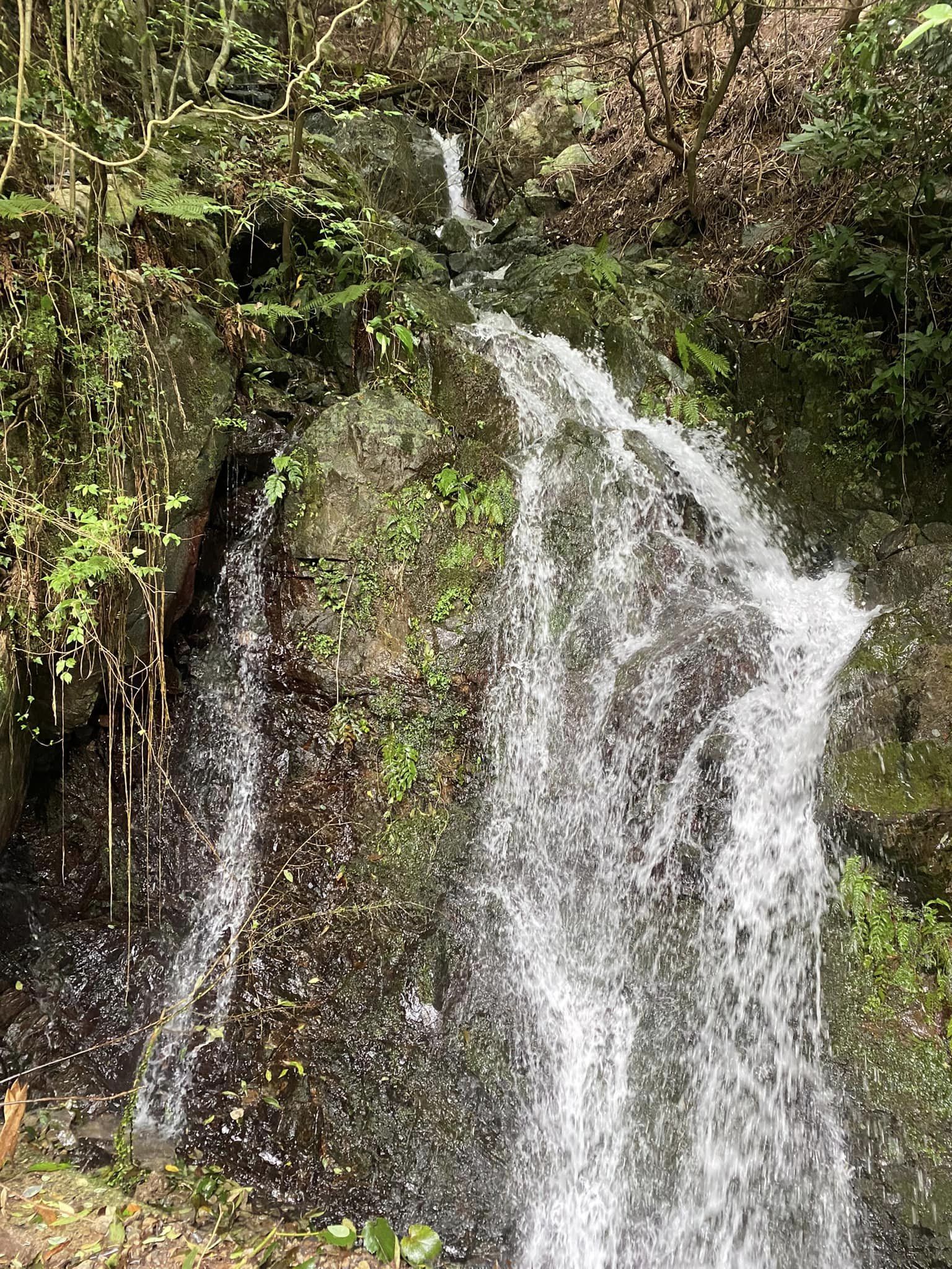 山奥で少し薄暗く携帯電話の電波もなく少し心細いなぁ〜と思いました。と、突然、左手に小さな滝が見えてきました。 絶妙なタイミングで現れたのでとてもホッとしました(笑)、さらに200メートルほど進むと、また左手に扇状の小さめな滝。さらに200メートルほど進むと。今度は右手に爆音とともに10メートルほどの大きな滝が見えてきました、これが「第一の滝」。